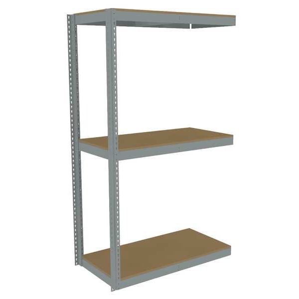 Boltless Shelving, Angle, Overall Depth 24 in, Overall Height 84 in, Overall Width 48 in, Shelf Gauge 14 ga, Shelf Adjustment Increments 1 1/2 in, Steel, Particleboard, Steel, (2) Posts, (3) Deck Levels, Includes Decking Yes, 2,250 lb, Whole Unit Load Capacity 6,750 lb, Add-On, Open, Post Gauge 16 ga, Number of Shelves 3, Maximum Post Load Capacity 8,000 lb with Beams Evenly Spaced at 24 in, Powder Coated, Heavy-Duty, Gray