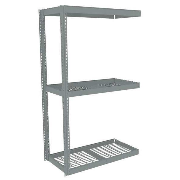 Boltless Shelving, Angle, Overall Depth 24 in, Overall Height 84 in, Overall Width 48 in, Shelf Gauge 14 ga, Shelf Adjustment Increments 1 1/2 in, Steel, Steel, Steel, (2) Posts, (3) Deck Levels, Includes Decking Yes, 2,250 lb, Whole Unit Load Capacity 6,750 lb, Add-On, Open, SCS Indoor Advantage(R) Certified, Post Gauge 16 ga, Number of Shelves 3, Maximum Post Load Capacity 8,000 lb with Beams Evenly Spaced at 24 in, Powder Coated, Heavy-Duty, Gray
