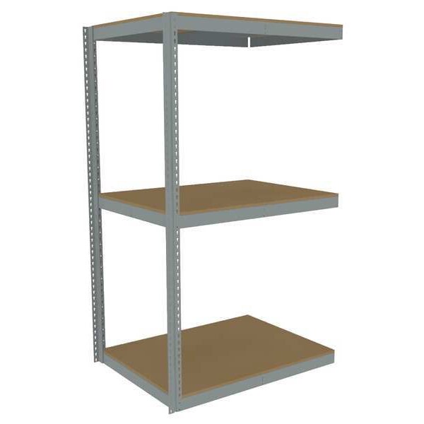 Boltless Shelving, Angle, Overall Depth 36 in, Overall Height 84 in, Overall Width 48 in, Shelf Gauge 14 ga, Shelf Adjustment Increments 1 1/2 in, Steel, Particleboard, Steel, (2) Posts, (3) Deck Levels, Includes Decking Yes, 2,250 lb, Whole Unit Load Capacity 6,750 lb, Add-On, Open, Post Gauge 16 ga, Number of Shelves 3, Maximum Post Load Capacity 8,000 lb with Beams Evenly Spaced at 24 in, Powder Coated, Heavy-Duty, Gray