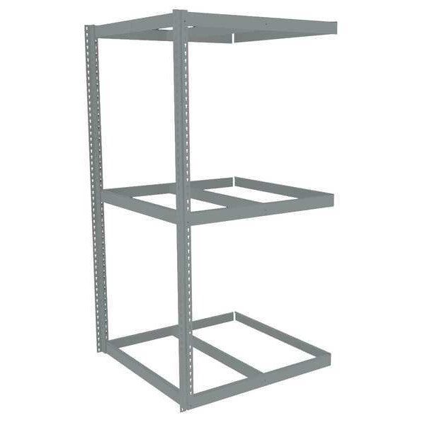 Boltless Shelving, Angle, Overall Depth 42 in, Overall Height 84 in, Overall Width 48 in, Shelf Gauge 14 ga, Shelf Adjustment Increments 1 1/2 in, Steel, None, Steel, (12) Beams, (2) Posts, Includes Decking No, 2,250 lb, Whole Unit Load Capacity 6,750 lb, Add-On, Open, SCS Indoor Advantage(R) Certified, Post Gauge 16 ga, Number of Shelves 3, Maximum Post Load Capacity 8,000 lb with Beams Evenly Spaced at 24 in, Powder Coated, Heavy-Duty, Gray