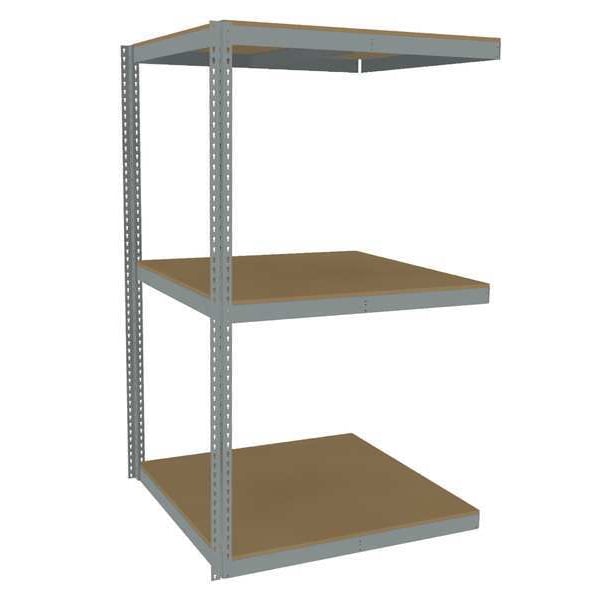 Boltless Shelving, Angle, Overall Depth 48 in, Overall Height 84 in, Overall Width 48 in, Shelf Gauge 14 ga, Shelf Adjustment Increments 1 1/2 in, Steel, Particleboard, Steel, (2) Posts, (3) Deck Levels, Includes Decking Yes, 2,250 lb, Whole Unit Load Capacity 6,750 lb, Add-On, Open, Post Gauge 16 ga, Number of Shelves 3, Maximum Post Load Capacity 8,000 lb with Beams Evenly Spaced at 24 in, Powder Coated, Heavy-Duty, Gray