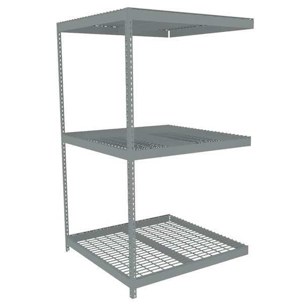Boltless Shelving, Angle, Overall Depth 48 in, Overall Height 84 in, Overall Width 48 in, Shelf Gauge 14 ga, Shelf Adjustment Increments 1 1/2 in, Steel, Steel, Steel, (2) Posts, (3) Deck Levels, Includes Decking Yes, 2,250 lb, Whole Unit Load Capacity 6,750 lb, Add-On, Open, SCS Indoor Advantage(R) Certified, Post Gauge 16 ga, Number of Shelves 3, Maximum Post Load Capacity 8,000 lb with Beams Evenly Spaced at 24 in, Powder Coated, Heavy-Duty, Gray