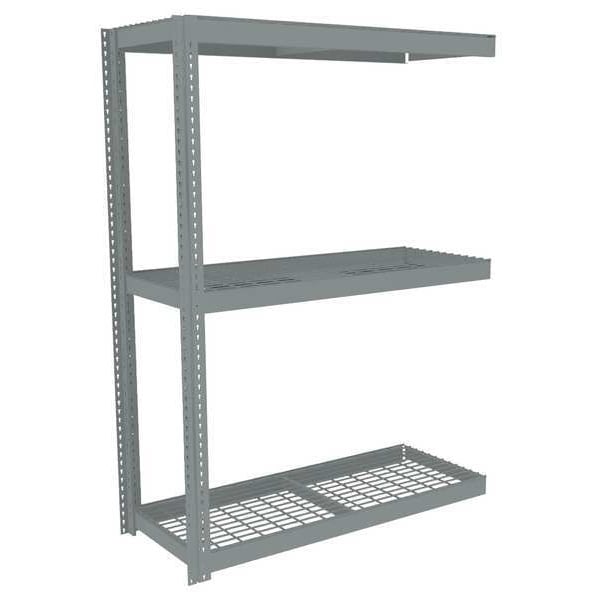 Boltless Shelving, Channel, Overall Depth 18 in, Overall Height 84 in, Overall Width 60 in, Shelf Gauge 14 ga, Shelf Adjustment Increments 1 1/2 in, Steel, Steel, Steel, (12) Beams, (2) Posts, Includes Decking Yes, 2,250 lb, Whole Unit Load Capacity 6,750 lb, Add-On, Open, SCS Indoor Advantage(R) Certified, Post Gauge 16 ga, Number of Shelves 3, Maximum Post Load Capacity 13,000 lb with Beam Evenly Spaced at 24 in, Powder Coated, Heavy-Duty, Gray