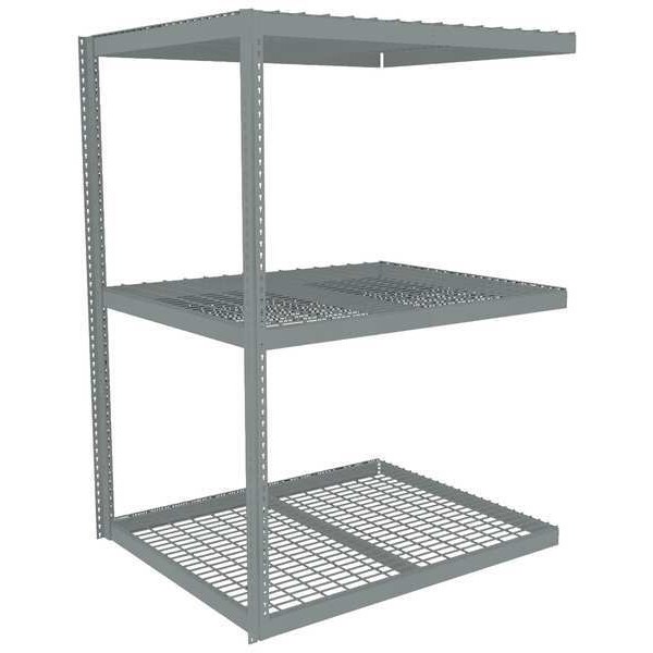 Boltless Shelving, Angle, Overall Depth 48 in, Overall Height 84 in, Overall Width 60 in, Shelf Gauge 14 ga, Shelf Adjustment Increments 1 1/2 in, Steel, Steel, Steel, (12) Beams, (2) Posts, Includes Decking Yes, 2,000 lb, Whole Unit Load Capacity 6,000 lb, Add-On, Open, SCS Indoor Advantage(R) Certified, Post Gauge 16 ga, Number of Shelves 3, Maximum Post Load Capacity 8,000 lb with Beams Evenly Spaced at 24 in, Powder Coated, Heavy-Duty, Gray