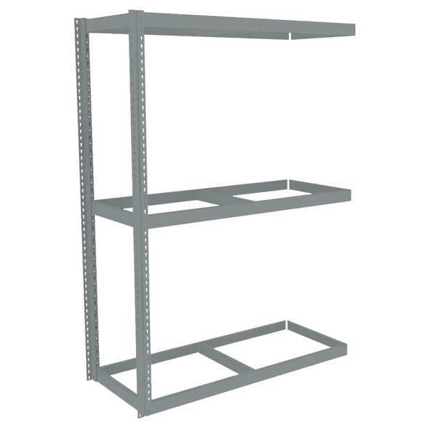 Boltless Shelving, Angle, Overall Depth 18 in, Overall Height 84 in, Overall Width 72 in, Shelf Gauge 14 ga, Shelf Adjustment Increments 1 1/2 in, Steel, None, Steel, (12) Beams, (2) Posts, Includes Decking No, 1,750 lb, Whole Unit Load Capacity 5,250 lb, Add-On, Open, SCS Indoor Advantage(R) Certified, Post Gauge 16 ga, Number of Shelves 3, Maximum Post Load Capacity 8,000 lb with Beams Evenly Spaced at 24 in, Powder Coated, Heavy-Duty, Gray