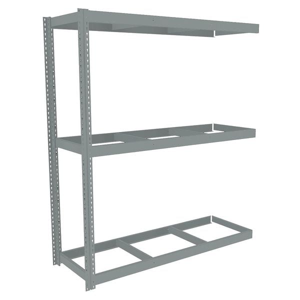 Boltless Shelving, Channel, Overall Depth 24 in, Overall Height 84 in, Overall Width 72 in, Shelf Gauge 14 ga, Shelf Adjustment Increments 1 1/2 in, Steel, None, Steel, (2) Posts, (3) HD Deck Levels, Includes Decking No, 2,000 lb, Whole Unit Load Capacity 6,000 lb, Add-On, Open, SCS Indoor Advantage(R) Certified, Post Gauge 16 ga, Number of Shelves 3, Maximum Post Load Capacity 13,000 lb with Beam Evenly Spaced at 24 in, Powder Coated, Heavy-Duty, Gray