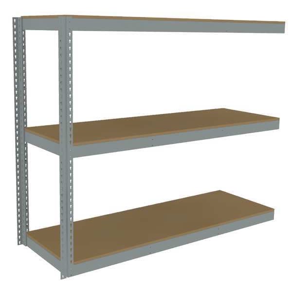 Boltless Shelving, Angle, Overall Depth 24 in, Overall Height 60 in, Overall Width 72 in, Shelf Gauge 14 ga, Shelf Adjustment Increments 1 1/2 in, Steel, Particleboard, Steel, (2) Posts, (3) Deck Levels, Includes Decking Yes, 1,750 lb, Whole Unit Load Capacity 5,250 lb, Add-On, Open, Post Gauge 16 ga, Number of Shelves 3, Maximum Post Load Capacity 8,000 lb with Beams Evenly Spaced at 24 in, Powder Coated, Heavy-Duty, Gray