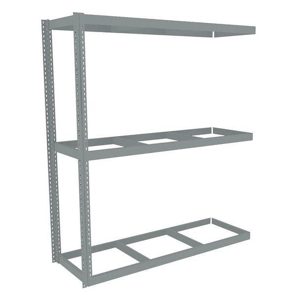Boltless Shelving, Angle, Overall Depth 24 in, Overall Height 84 in, Overall Width 72 in, Shelf Gauge 14 ga, Shelf Adjustment Increments 1 1/2 in, Steel, None, Steel, (2) Posts, (3) Deck Levels, Includes Decking No, 1,750 lb, Whole Unit Load Capacity 5,250 lb, Add-On, Open, SCS Indoor Advantage(R) Certified, Post Gauge 16 ga, Number of Shelves 3, Maximum Post Load Capacity 8,000 lb with Beams Evenly Spaced at 24 in, Powder Coated, Heavy-Duty, Gray