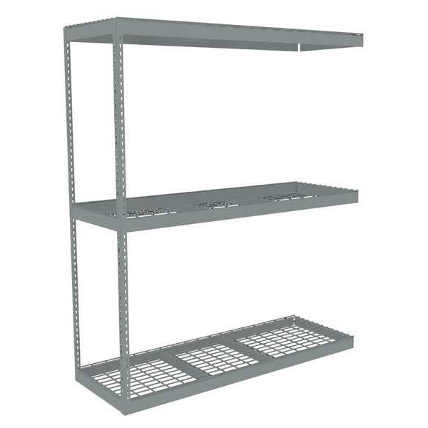 Boltless Shelving, Angle, Overall Depth 24 in, Overall Height 84 in, Overall Width 72 in, Shelf Gauge 14 ga, Shelf Adjustment Increments 1 1/2 in, Steel, Steel, Steel, (2) Posts, (3) Deck Levels, Includes Decking Yes, 1,750 lb, Whole Unit Load Capacity 5,250 lb, Add-On, Open, SCS Indoor Advantage(R) Certified, Post Gauge 16 ga, Number of Shelves 3, Maximum Post Load Capacity 8,000 lb with Beams Evenly Spaced at 24 in, Powder Coated, Heavy-Duty, Gray