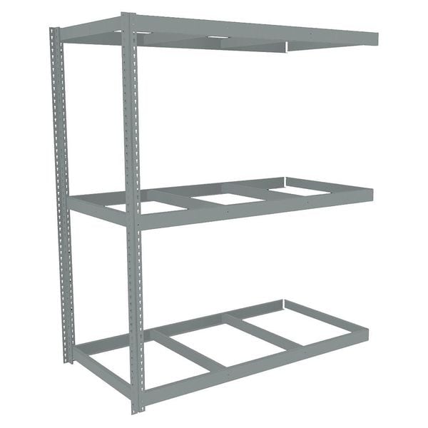 Boltless Shelving, Channel, Overall Depth 36 in, Overall Height 84 in, Overall Width 72 in, Shelf Gauge 14 ga, Shelf Adjustment Increments 1 1/2 in, Steel, None, Steel, (2) Posts, (3) HD Deck Levels, Includes Decking No, 2,000 lb, Whole Unit Load Capacity 6,000 lb, Add-On, Open, SCS Indoor Advantage(R) Certified, Post Gauge 16 ga, Number of Shelves 3, Maximum Post Load Capacity 13,000 lb with Beam Evenly Spaced at 24 in, Powder Coated, Heavy-Duty, Gray
