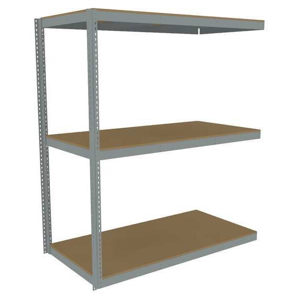 Boltless Shelving, Angle, Overall Depth 36 in, Overall Height 84 in, Overall Width 72 in, Shelf Gauge 14 ga, Shelf Adjustment Increments 1 1/2 in, Steel, Particleboard, Steel, (2) Posts, (3) Deck Levels, Includes Decking Yes, 1,750 lb, Whole Unit Load Capacity 5,250 lb, Add-On, Open, Post Gauge 16 ga, Number of Shelves 3, Maximum Post Load Capacity 8,000 lb with Beams Evenly Spaced at 24 in, Powder Coated, Heavy-Duty, Gray