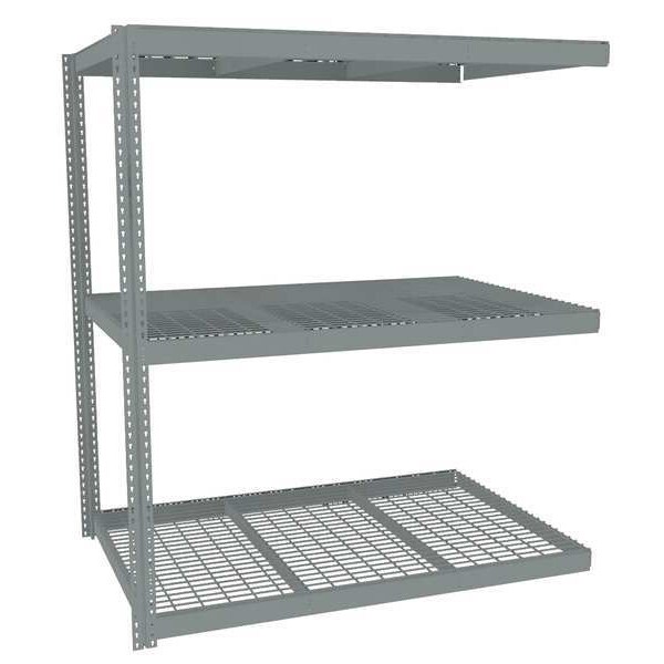 Boltless Shelving, Channel, Overall Depth 48 in, Overall Height 84 in, Overall Width 72 in, Shelf Gauge 14 ga, Shelf Adjustment Increments 1 1/2 in, Steel, Steel, Steel, (2) Posts, (3) HD Deck Levels, Includes Decking Yes, 2,000 lb, Whole Unit Load Capacity 6,000 lb, Add-On, Open, SCS Indoor Advantage(R) Certified, Post Gauge 16 ga, Number of Shelves 3, Maximum Post Load Capacity 13,000 lb with Beam Evenly Spaced at 24 in, Powder Coated, Heavy-Duty, Gray