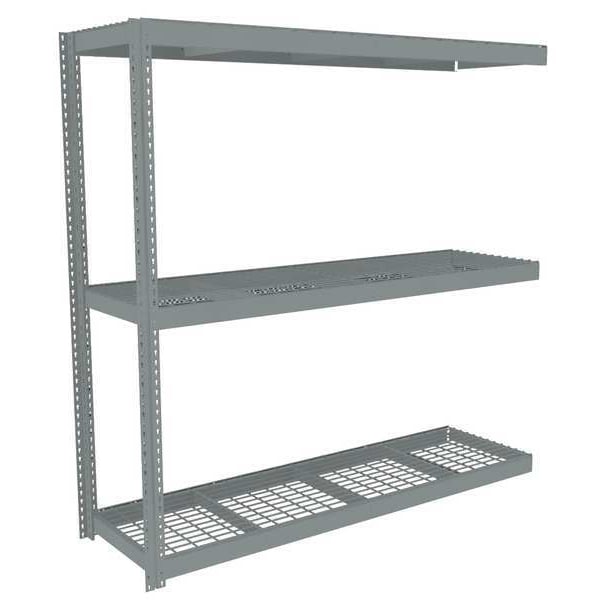Boltless Shelving, Channel, Overall Depth 24 in, Overall Height 84 in, Overall Width 84 in, Shelf Gauge 14 ga, Shelf Adjustment Increments 1 1/2 in, Steel, Steel, Steel, (12) Beams, (2) Posts, Includes Decking Yes, 1,750 lb, Whole Unit Load Capacity 5,250 lb, Add-On, Open, SCS Indoor Advantage(R) Certified, Post Gauge 16 ga, Number of Shelves 3, Maximum Post Load Capacity 13,000 lb with Beam Evenly Spaced at 24 in, Powder Coated, Heavy-Duty, Gray