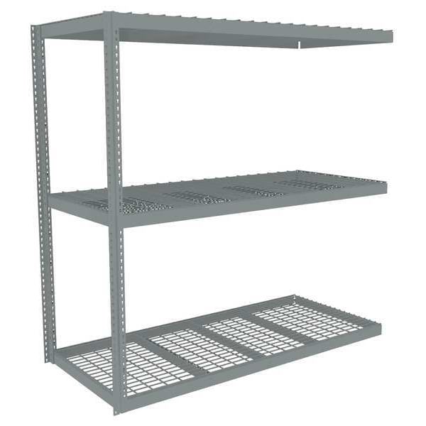 Boltless Shelving, Angle, Overall Depth 36 in, Overall Height 84 in, Overall Width 84 in, Shelf Gauge 14 ga, Shelf Adjustment Increments 1 1/2 in, Steel, Steel, Steel, (12) Beams, (2) Posts, Includes Decking Yes, 1,500 lb, Whole Unit Load Capacity 4,500 lb, Add-On, Open, SCS Indoor Advantage(R) Certified, Post Gauge 16 ga, Number of Shelves 3, Maximum Post Load Capacity 8,000 lb with Beams Evenly Spaced at 24 in, Powder Coated, Heavy-Duty, Gray