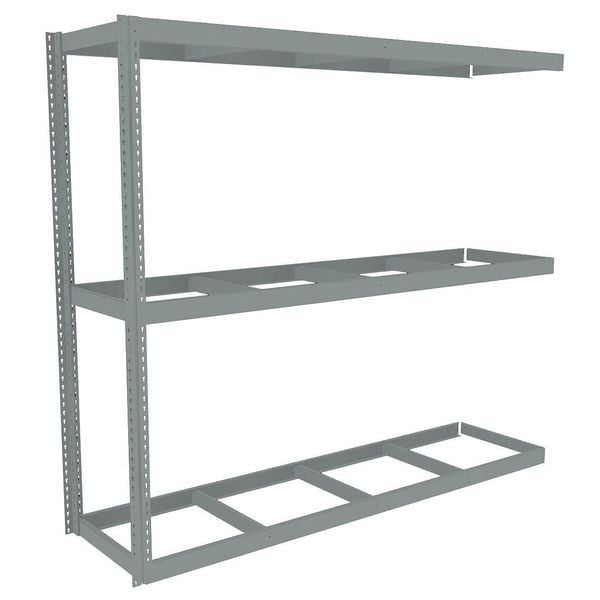 Boltless Shelving, Channel, Overall Depth 24 in, Overall Height 84 in, Overall Width 96 in, Shelf Gauge 14 ga, Shelf Adjustment Increments 1 1/2 in, Steel, None, Steel, (2) Posts, (3) HD Deck Levels, Includes Decking No, 1,600 lb, Whole Unit Load Capacity 4,800 lb, Add-On, Open, SCS Indoor Advantage(R) Certified, Post Gauge 16 ga, Number of Shelves 3, Maximum Post Load Capacity 13,000 lb with Beam Evenly Spaced at 24 in, Powder Coated, Heavy-Duty, Gray