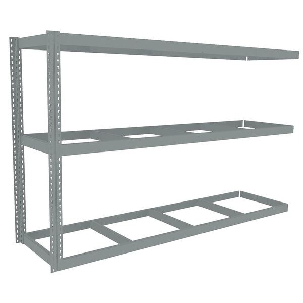 Boltless Shelving, Angle, Overall Depth 24 in, Overall Height 60 in, Overall Width 96 in, Shelf Gauge 14 ga, Shelf Adjustment Increments 1 1/2 in, Steel, None, Steel, (2) Posts, (3) Deck Levels, Includes Decking No, 1,250 lb, Whole Unit Load Capacity 3,750 lb, Add-On, Open, SCS Indoor Advantage(R) Certified, Post Gauge 16 ga, Number of Shelves 3, Maximum Post Load Capacity 8,000 lb with Beams Evenly Spaced at 24 in, Powder Coated, Heavy-Duty, Gray