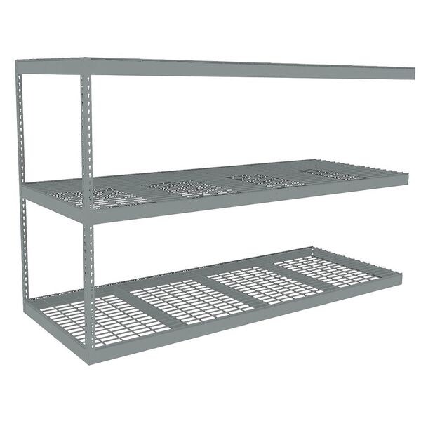 Boltless Shelving, Angle, Overall Depth 36 in, Overall Height 60 in, Overall Width 96 in, Shelf Gauge 14 ga, Shelf Adjustment Increments 1 1/2 in, Steel, Steel, Steel, (2) Posts, (3) Deck Levels, Includes Decking Yes, 1,250 lb, Whole Unit Load Capacity 3,750 lb, Add-On, Open, SCS Indoor Advantage(R) Certified, Post Gauge 16 ga, Number of Shelves 3, Maximum Post Load Capacity 8,000 lb with Beams Evenly Spaced at 24 in, Powder Coated, Heavy-Duty, Gray