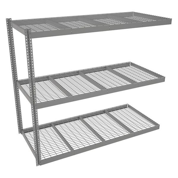 Boltless Shelving, Channel, Overall Depth 42 in, Overall Height 84 in, Overall Width 96 in, Shelf Gauge 14 ga, Shelf Adjustment Increments 1 1/2 in, Steel, Steel, Steel, (12) Beams, (2) Posts, Includes Decking Yes, 1,600 lb, Whole Unit Load Capacity 4,800 lb, Add-On, Open, SCS Indoor Advantage(R) Certified, Post Gauge 16 ga, Number of Shelves 3, Maximum Post Load Capacity 13,000 lb with Beam Evenly Spaced at 24 in, Powder Coated, Heavy-Duty, Gray