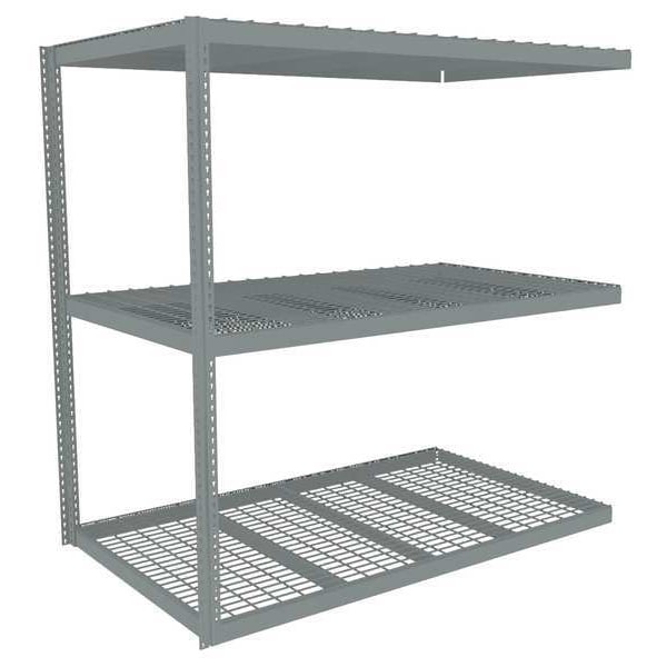 Boltless Shelving, Angle, Overall Depth 42 in, Overall Height 84 in, Overall Width 96 in, Shelf Gauge 14 ga, Shelf Adjustment Increments 1 1/2 in, Steel, Steel, Steel, (12) Beams, (2) Posts, Includes Decking Yes, 1,250 lb, Whole Unit Load Capacity 3,750 lb, Add-On, Open, SCS Indoor Advantage(R) Certified, Post Gauge 16 ga, Number of Shelves 3, Maximum Post Load Capacity 8,000 lb with Beams Evenly Spaced at 24 in, Powder Coated, Heavy-Duty, Gray