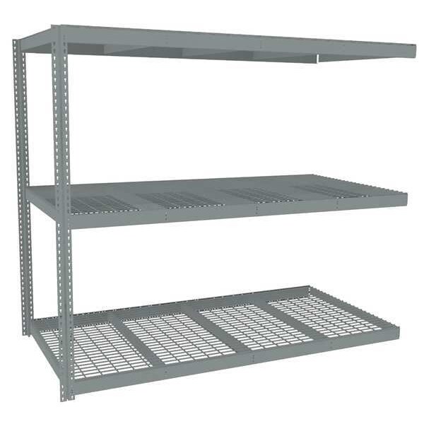 Boltless Shelving, Channel, Overall Depth 48 in, Overall Height 84 in, Overall Width 96 in, Shelf Gauge 14 ga, Shelf Adjustment Increments 1 1/2 in, Steel, Steel, Steel, (2) Posts, (3) HD Deck Levels, Includes Decking Yes, 1,600 lb, Whole Unit Load Capacity 4,800 lb, Add-On, Open, SCS Indoor Advantage(R) Certified, Post Gauge 16 ga, Number of Shelves 3, Maximum Post Load Capacity 13,000 lb with Beam Evenly Spaced at 24 in, Powder Coated, Heavy-Duty, Gray