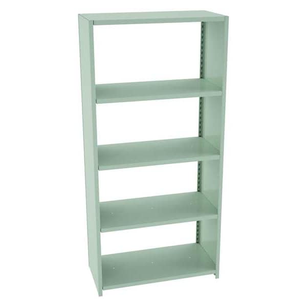Boltless Shelving, Low Profile, Overall Depth 18 in, Overall Height 78 in, Overall Width 36 in, Shelf Gauge 14 ga, Shelf Adjustment Increments 1 1/2 in, Steel, Steel, Steel, (2) Uprights, (8) Shelf Reinforcements, Shelf Supports, Includes Decking Yes, 950 lb, Whole Unit Load Capacity 4,750 lb, Starter, Closed, Post Gauge 18 ga, Number of Shelves 5, Maximum Post Load Capacity 3,500 lb with Beams Evenly Spaced at 24 in, Powder Coated, Medium-Duty, Light Gray