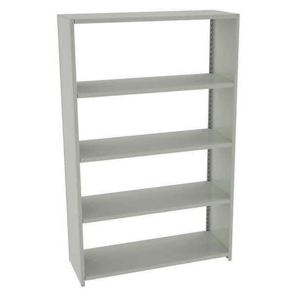 Boltless Shelving, Low Profile, Overall Depth 18 in, Overall Height 78 in, Overall Width 48 in, Shelf Gauge 14 ga, Shelf Adjustment Increments 1 1/2 in, Steel, Steel, Steel, (2) Uprights, (8) Shelf Reinforcements, Shelf Supports, Includes Decking Yes, 700 lb, Whole Unit Load Capacity 3,500 lb, Starter, Closed, Post Gauge 18 ga, Number of Shelves 5, Maximum Post Load Capacity 3,500 lb with Beams Evenly Spaced at 24 in, Powder Coated, Medium-Duty, Light Gray