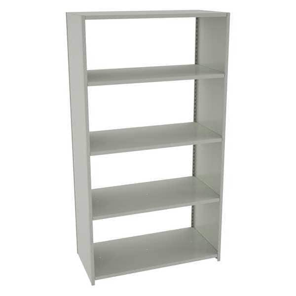 Boltless Shelving, Low Profile, Overall Depth 24 in, Overall Height 90 in, Overall Width 48 in, Shelf Gauge 14 ga, Shelf Adjustment Increments 1 1/2 in, Steel, Steel, Steel, (2) Uprights, (8) Shelf Reinforcements, Shelf Supports, Includes Decking Yes, 800 lb, Whole Unit Load Capacity 4,000 lb, Starter, Closed, Post Gauge 18 ga, Number of Shelves 5, Maximum Post Load Capacity 3,500 lb with Beams Evenly Spaced at 24 in, Powder Coated, Medium-Duty, Light Gray