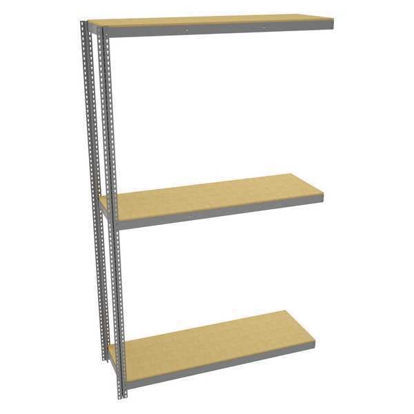 Boltless Shelving, Angle, Overall Depth 24 in, Overall Height 120 in, Overall Width 72 in, Shelf Gauge 14 ga, Shelf Adjustment Increments 1 1/2 in, Steel, Particleboard, Steel, (2) Posts, (3) Deck Levels, Includes Decking Yes, 1,750 lb, Whole Unit Load Capacity 5,250 lb, Add-On, Open, SCS Indoor Advantage(R) Certified, Post Gauge 16 ga, Number of Shelves 3, Maximum Post Load Capacity 8,000 lb with Beams Evenly Spaced at 24 in, Powder Coated, Heavy-Duty, Gray