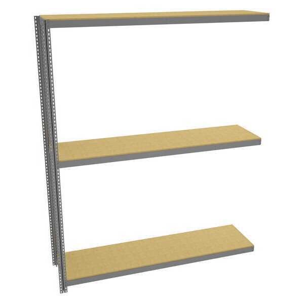 Boltless Shelving, Angle, Overall Depth 24 in, Overall Height 120 in, Overall Width 96 in, Shelf Gauge 14 ga, Shelf Adjustment Increments 1 1/2 in, Steel, Particleboard, Steel, (2) Posts, (3) Deck Levels, Includes Decking Yes, 1,250 lb, Whole Unit Load Capacity 3,750 lb, Add-On, Open, SCS Indoor Advantage(R) Certified, Post Gauge 16 ga, Number of Shelves 3, Maximum Post Load Capacity 8,000 lb with Beams Evenly Spaced at 24 in, Powder Coated, Heavy-Duty, Gray