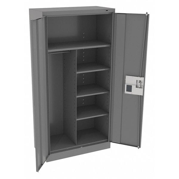 Storage Cabinet, Base Type Frame, Body Panel Type Solid, Cabinet Color Medium Gray, Cabinet Material Steel, Cabinet Storage Components Hanging Rods, Shelves, Door Handle Type Recessed Pull, Door Type Solid, Duty Rating Light Duty, For Use Indoors/Outdoors No, Frame Assembled Assembled, Load Capacity per Shelf 150 lb, Lock Type Electronic Keypad, Mobility Stationary, Mounting Location Freestanding, Number of Shelves 5, Overall Depth 18 in, Overall Height 72 in, Overall Width 36 in