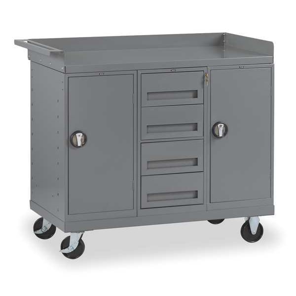 Mobile Cabinet Workbench, Top Material Steel, Color Gray, Non-Metal Top Thickness Not Applicable, Number of Doors 2, Number of Drawers 4, Number of Shelves 1, Overall Depth 25 in, Overall Height 43 in, Overall Load Capacity 1,000 lb, Overall Width 38 in, Top Metal Material Gauge 16 ga, Included Components Drawers, Assembly Partially Assembled, Brake Type Wheel Brake, Cabinet Interior Depth 22 in, Caster Mount Type Bracket, Caster Type (2) Rigid, (2) Swivel, Door Type Standard/Hinged