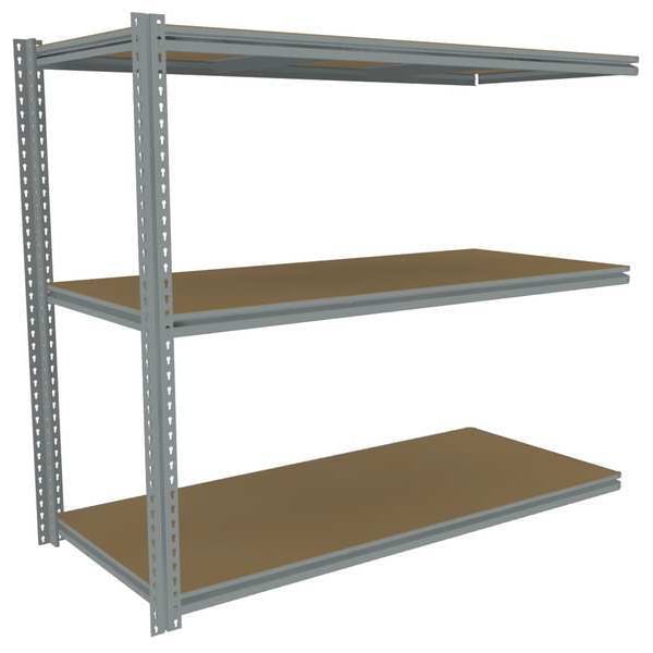 Boltless Shelving, Medium Profile, Overall Depth 30 in, Overall Height 60 in, Overall Width 69 in, Shelf Gauge 11 ga, Shelf Adjustment Increments 1 1/2 in, Steel, Particleboard, Steel, (2) Posts, Includes Decking Yes, 650 lb, Whole Unit Load Capacity 1,950 lb, Add-On, Open, ANSI BIFMA CREL, Post Gauge 16 ga, Number of Shelves 3, Maximum Post Load Capacity 8,000 lb with Beams Evenly Spaced at 24 in, Powder Coated, Medium-Duty, Sand