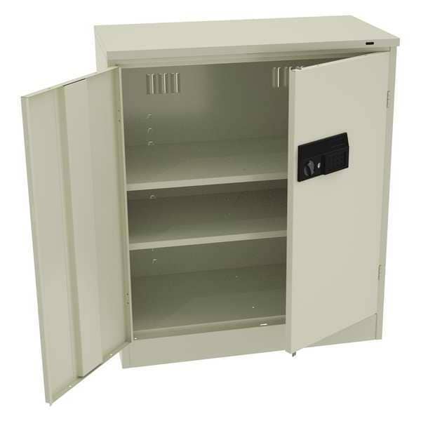 Storage Cabinet, Base Type Leveling, Body Panel Type Solid, Cabinet Color Putty, Cabinet Material Steel, Cabinet Storage Components Shelves, Door Handle Type Recessed Pull, Door Type Solid, Duty Rating Medium Duty, For Use Indoors/Outdoors No, Frame Assembled Assembled, Load Capacity per Shelf 200 lb, Lock Type Electronic Keypad, Mobility Stationary, Mounting Location Freestanding, Number of Shelves 2, Overall Depth 18 in, Overall Height 42 in, Overall Width 36 in, Cabinet Finish Powder Coated