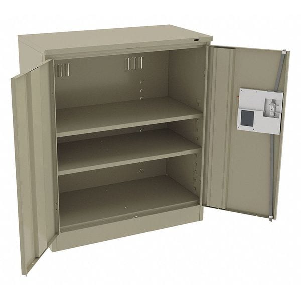 Storage Cabinet, Base Type Frame, Body Panel Type Solid, Cabinet Color Sand, Cabinet Material Steel, Cabinet Storage Components Shelves, Door Handle Type Recessed Pull, Door Type Solid, Duty Rating Light Duty, For Use Indoors/Outdoors No, Frame Assembled Assembled, Load Capacity per Shelf 200 lb, Lock Type Electronic Keypad, Mobility Stationary, Mounting Location Freestanding, Number of Shelves 2, Overall Depth 18 in, Overall Height 42 in, Overall Width 36 in, Cabinet Finish Powder Coated