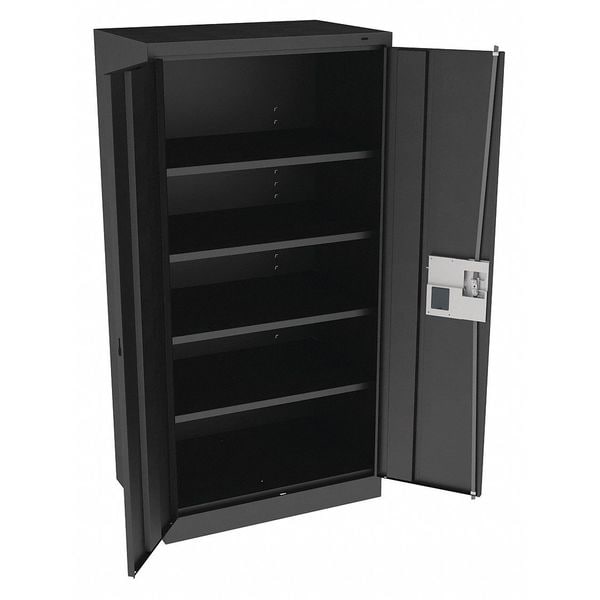 Storage Cabinet, Base Type Frame, Body Panel Type Solid, Cabinet Color Black, Cabinet Material Steel, Cabinet Storage Components Shelves, Door Handle Type Recessed Pull, Door Type Solid, Duty Rating Light Duty, For Use Indoors/Outdoors No, Frame Assembled Assembled, Load Capacity per Shelf 200 lb, Lock Type Electronic Keypad, Mobility Stationary, Mounting Location Freestanding, Number of Shelves 4, Overall Depth 24 in, Overall Height 72 in, Overall Width 36 in, Cabinet Finish Powder Coated