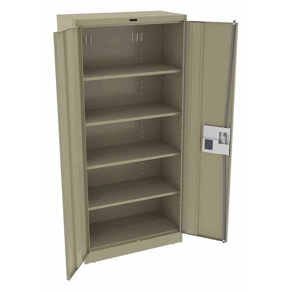 Storage Cabinet, Base Type Leveling, Body Panel Type Solid, Cabinet Color Sand, Cabinet Material Steel, Cabinet Storage Components Shelves, Door Handle Type Recessed Pull, Door Type Solid, Duty Rating Light Duty, For Use Indoors/Outdoors No, Frame Assembled Assembled, Load Capacity per Shelf 200 lb, Lock Type Electronic Keypad, Mobility Stationary, Mounting Location Freestanding, Number of Shelves 4, Overall Depth 18 in, Overall Height 78 in, Overall Width 36 in, Cabinet Finish Powder Coated