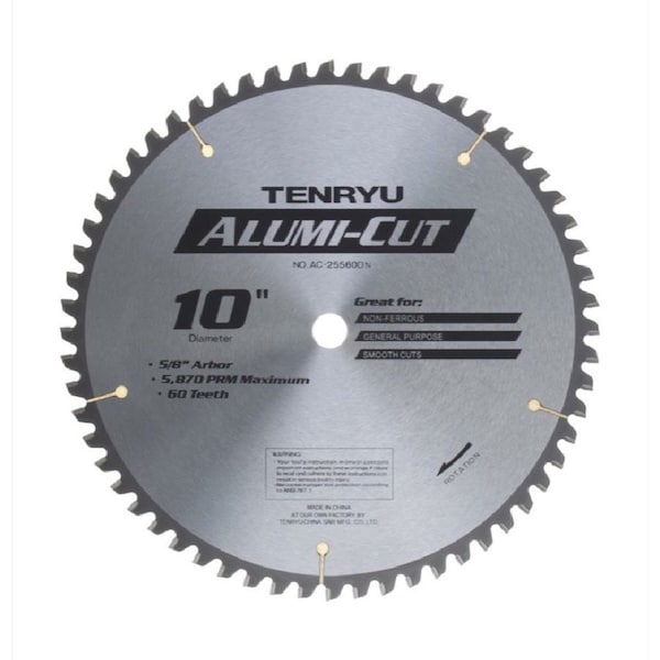 Tenryu AC-25560DN 10in Alumi-Cut Carbide Tipped BladeSpecifications Diameter: 10inTeeth: 60Arbor: 5/8inKerf: .087inGrind: TCG Rake: -5Application: Super easy cutting blade. Alumi-Cut Series: Tenryufts best value for your non-ferrous metal cutting needs. Offers true quality and affordability with each cut. Resharpenable for long life, the Alumi-Cut blades will help improve your bottom line. These blades are great for cutting aluminum, copper, brass, bronze, and other non-ferrous metals. Works well in many plastics, woodworking, and laminated floORg with slide-miters or table saws.Features: Fully-hardened, expertly-tensioned tool steel bodies for true and accurate cuts. Appropriate triple-chip grind pattern for non-ferrous metals. Quality carbide ground to precision