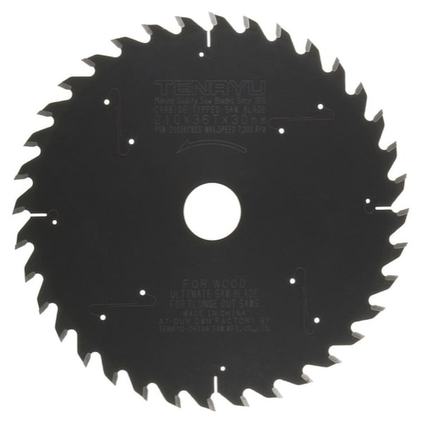 Tenryu PSW-21036CBD3 210mm Plunge-Cut Saw Blade for FESTOOL TS75 Specifications: Diameter: 210mmTeeth: 36Arbor: 30mmGrind: ATB Kerf: .087inRake: 15Plate: .063inApplication: Combination Ripping & Cross Cutting on WoodTenryu spent 5 years doing research and development to produce the ultimate plunge-cut saw blades for various applications.Features: Resin filled laser cut slots to reduce cutting noise and to reduce vibration PTFE coated plate to reduce pitch build-up and to lower resistance Select grade of carbide tips for industrial quality jobs ATAF shear face grind for splinter-free cross cuts