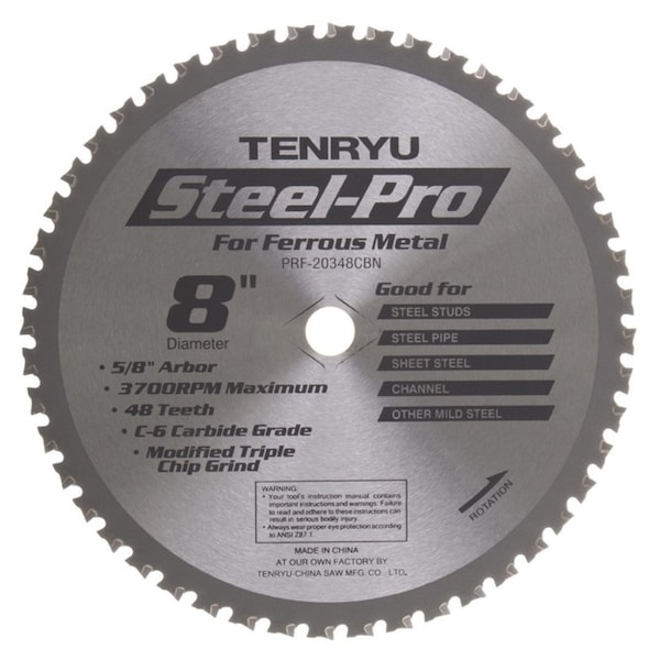 Tenryu PRF-20348CBN 8in Ferrous Metal Cutting Saw BladeSpecifications Diameter: 8inTeeth: 48Arbor: 5/8inGrind: ATB Kerf: .087inRake: 0Application: For ferrous metal cutting. General application.Cut ferrous metals mild steel faster, cleaner, and easier. Save time, money, the environment, and not to mention.your respiratory health. Tenryufts Steel-Pro Series of steel cutting saw blades make light work out of all kinds of mild steel: steel studs, steel sheet, steel pipe, channel, threaded rod, and much more.Specially formulated C-6 carbide grade, combined with a unique tip design, resists breakage on impact and lasts longer - much longer than standard carbides or abrasive discs. Special tooth geometry with ininsertedin tooth design greatly improves tip security, efficiency, and durability.Features: Rugged plates and specially formulated carbide tips with a special tooth grind for fast, clean cuts High quality cuts without the clouds of dust and scorch marks associated with friction blades Cool cuts that leave the work piece edge free of burrs Reduced cost-per-cut and maximized performance for the operator as a result of fewer blade changes