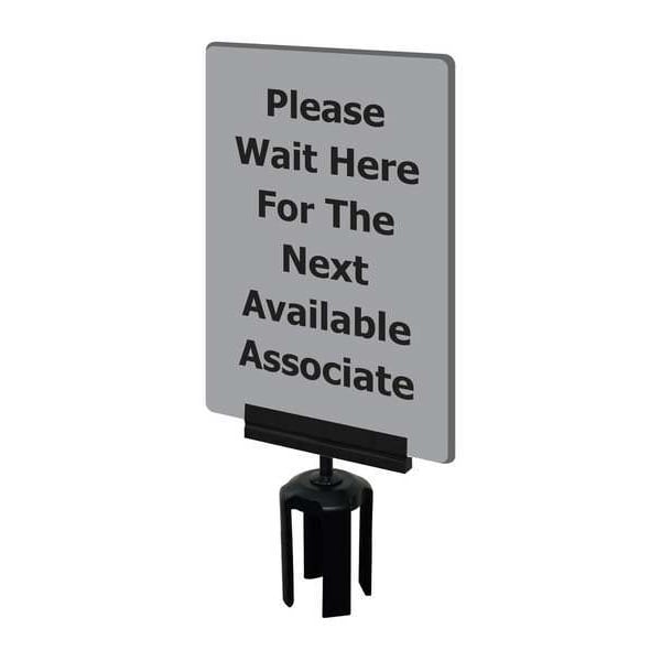 Acrylic Sign, For Use With Tensabarrier Posts, Includes Mounting Adapter, Legend Please Wait Here For The Next Available Associate, Legend Color Black, Color Gray, Material Acrylic, Finish Unfinished, Overall Length 11 in, Overall Width 7 in