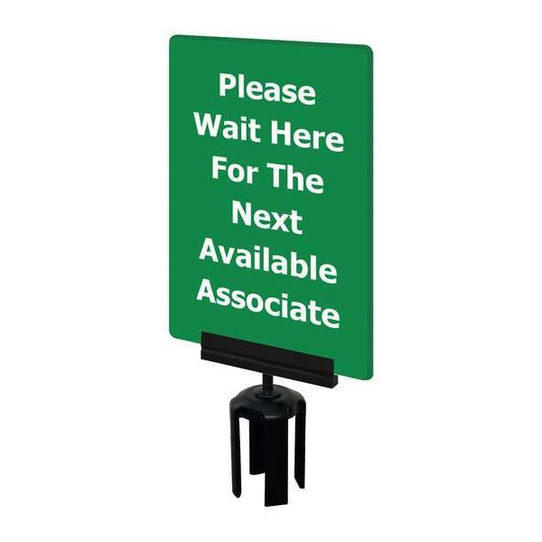Acrylic Sign, For Use With Tensabarrier Posts, Includes Mounting Adapter, Legend Please Wait Here For The Next Available Associate, Legend Color White, Color Green, Material Acrylic, Finish Unfinished, Overall Length 11 in, Overall Width 7 in