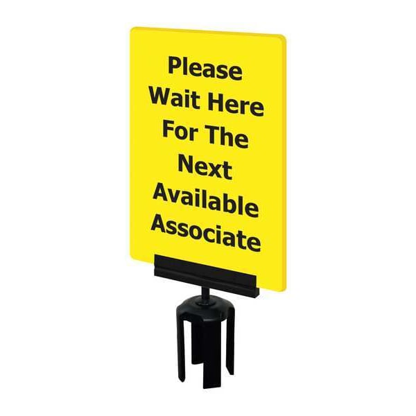 Acrylic Sign, For Use With Tensabarrier Posts, Includes Mounting Adapter, Legend Please Wait Here For The Next Available Associate, Color Yellow, Material Acrylic, Overall Length 11 in, Overall Width 7 in
