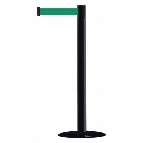 Barrier Post with Belt, Maximum Overall Height 37 1/2 in, Legend No Legend, Legend Color Not Applicable, Number of Belts 1, Belt Length 7 1/2 ft, Belt Width 2 in, Belt Color Green, Belt Pattern No Pattern, Post Color Black, Product Type Stanchion, Minimum Overall Height Not Applicable, Post Diameter 2 1/2 in, Post Material Plastic, Post Finish Black, Base Type Basic, Base Diameter 14 in, Base Material Cast Iron, Base Finish Black ABS No Scuff Cover, Base Color Black, ADA Compliance Yes