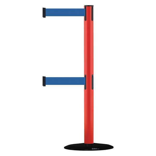 Barrier Post with Belt, Maximum Overall Height 38 in, Legend No Legend, Legend Color Not Applicable, Number of Belts 2, Belt Length 7 1/2 ft, Belt Width 2 in, Belt Color Blue, Belt Pattern No Pattern, Post Color Red, Product Type Stanchion, Minimum Overall Height Not Applicable, Post Diameter 2 1/2 in, Post Material Metal Alloy, Post Finish Powder Coated, Base Type Basic, Base Diameter 14 in, Base Material Cast Iron, Base Finish Black ABS No Scuff Cover, Base Color Black, ADA Compliance Yes