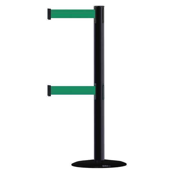 Barrier Post with Belt, Maximum Overall Height 38 in, Legend No Legend, Legend Color Not Applicable, Number of Belts 2, Belt Length 7 1/2 ft, Belt Width 2 in, Belt Color Green, Belt Pattern No Pattern, Post Color Black, Product Type Stanchion, Minimum Overall Height Not Applicable, Post Diameter 2 1/2 in, Post Material Metal Alloy, Post Finish Black, Base Type Basic, Base Diameter 14 in, Base Material Cast Iron, Base Finish Black ABS No Scuff Cover, Base Color Black, ADA Compliance Yes