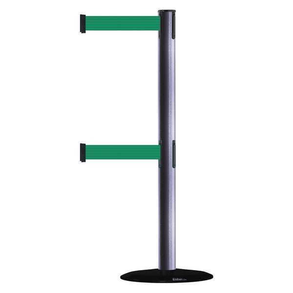 Barrier Post with Belt, Maximum Overall Height 38 in, Legend No Legend, Legend Color Not Applicable, Number of Belts 2, Belt Length 7 1/2 ft, Belt Width 2 in, Belt Color Green, Belt Pattern No Pattern, Post Color Gray, Product Type Stanchion, Minimum Overall Height Not Applicable, Post Diameter 2 1/2 in, Post Material Metal Alloy, Post Finish Powder Coated, Base Type Basic, Base Diameter 14 in, Base Material Cast Iron, Base Finish Black ABS No Scuff Cover, Base Color Black, ADA Compliance Yes