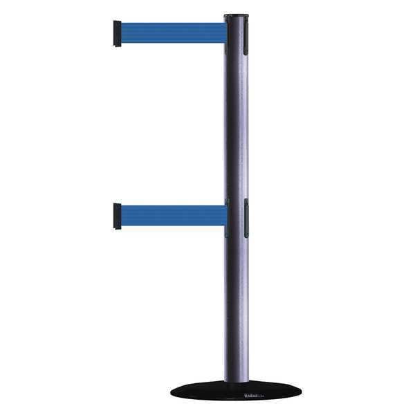 Barrier Post with Belt, Maximum Overall Height 38 in, Legend No Legend, Legend Color Not Applicable, Number of Belts 2, Belt Length 7 1/2 ft, Belt Width 2 in, Belt Color Blue, Belt Pattern No Pattern, Post Color Gray, Product Type Stanchion, Minimum Overall Height Not Applicable, Post Diameter 2 1/2 in, Post Material Metal Alloy, Post Finish Powder Coated, Base Type Basic, Base Diameter 14 in, Base Material Cast Iron, Base Finish Black ABS No Scuff Cover, Base Color Black, ADA Compliance Yes