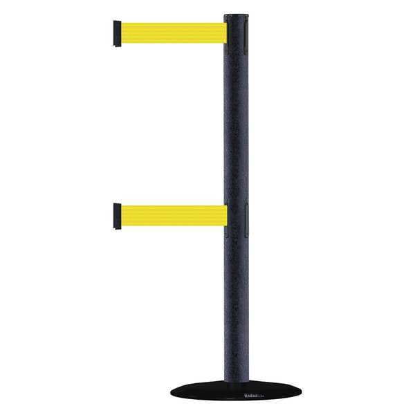 Barrier Post with Belt, Maximum Overall Height 38 in, Legend No Legend, Legend Color Not Applicable, Number of Belts 2, Belt Length 7 1/2 ft, Belt Width 2 in, Belt Color Yellow, Belt Pattern No Pattern, Post Color Black, Product Type Stanchion, Minimum Overall Height Not Applicable, Post Diameter 2 1/2 in, Post Material Metal Alloy, Post Finish Powder Coated, Base Type Basic, Base Diameter 14 in, Base Material Cast Iron, Base Finish Black ABS No Scuff Cover, Base Color Black, ADA Compliance Yes