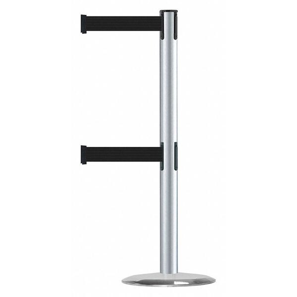 Barrier Post with Belt, Maximum Overall Height 38 in, Legend No Legend, Legend Color Not Applicable, Number of Belts 2, Belt Length 7 1/2 ft, Belt Width 2 in, Belt Color Black, Belt Pattern No Pattern, Product Type Stanchion, Minimum Overall Height Not Applicable, Post Diameter 2 1/2 in, Post Material Metal Alloy, Post Finish Satin Chrome, Base Type Standard, Base Diameter 14 in, Base Material Cast Iron, Base Finish Satin Chrome, ADA Compliance Yes, Height Adjustability Fixed Height