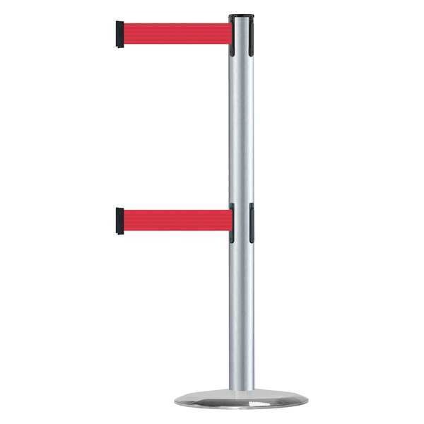 Barrier Post with Belt, Maximum Overall Height 38 in, Legend No Legend, Legend Color Not Applicable, Number of Belts 2, Belt Length 7 1/2 ft, Belt Width 2 in, Belt Color Red, Belt Pattern No Pattern, Product Type Stanchion, Minimum Overall Height Not Applicable, Post Diameter 2 1/2 in, Post Material Metal Alloy, Post Finish Satin Chrome, Base Type Standard, Base Diameter 14 in, Base Material Cast Iron, Base Finish Satin Chrome, ADA Compliance Yes, Height Adjustability Fixed Height